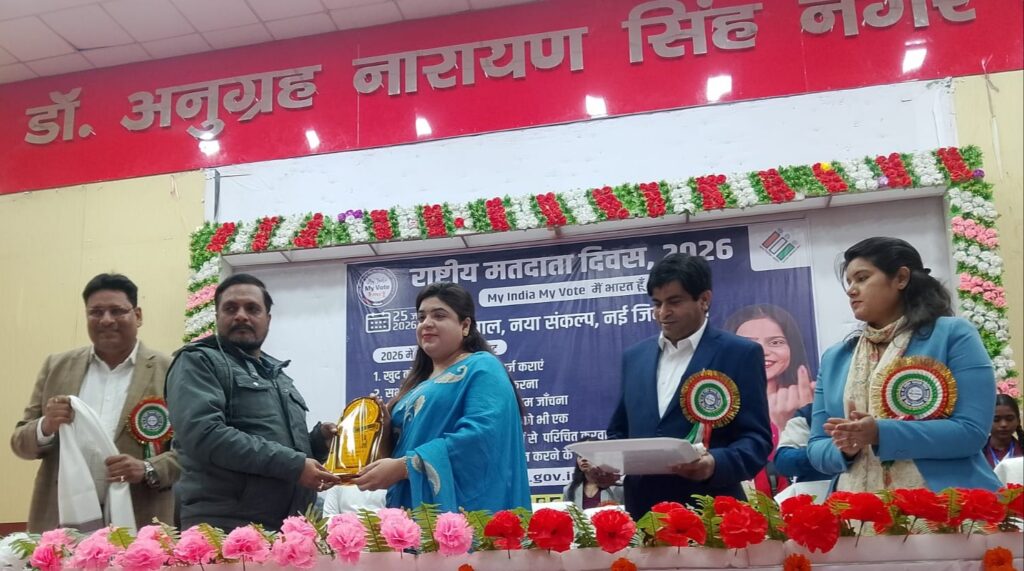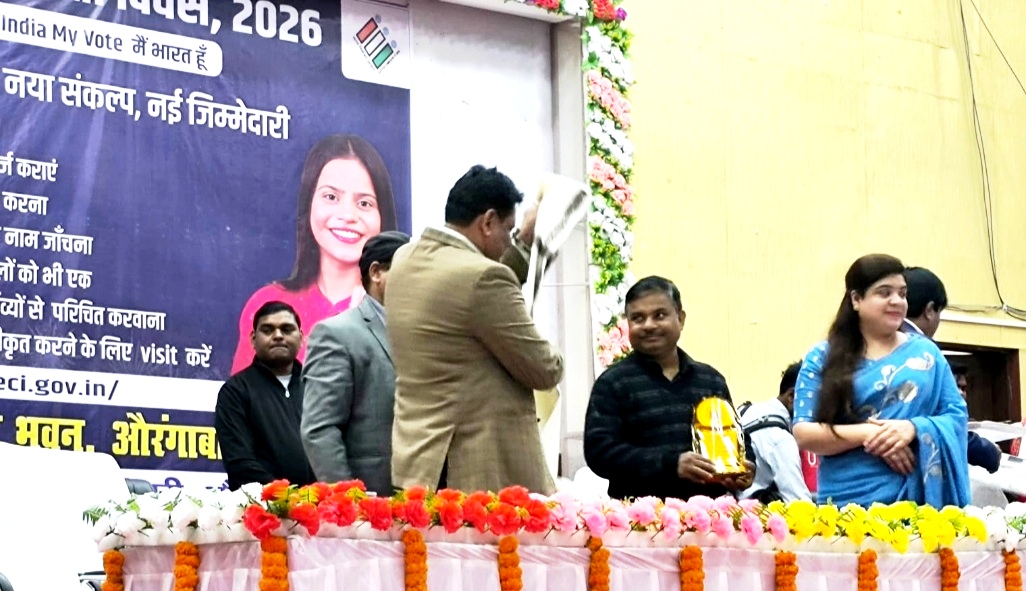औरंगाबाद : टाउन हॉल, औरंगाबाद में रविवार, 25 जनवरी 2026 को 16वां राष्ट्रीय मतदाता दिवस बड़े उत्साह और गरिमामय माहौल में मनाया गया। इस कार्यक्रम में जिला पदाधिकारी अभिलाषा शर्मा, पुलिस अधीक्षक अंबरीष राहुल, सदर अनुमंडल पदाधिकारी संतन कुमार सिंह, वरीय उप समाहर्ता एवं जिला सूचना जनसंपर्क पदाधिकारी श्रीमती रत्ना प्रियदर्शिनी सहित जिले के कई वरिष्ठ अधिकारी, कर्मचारी, पत्रकार साथी और बड़ी संख्या में आम लोग मौजूद रहे।